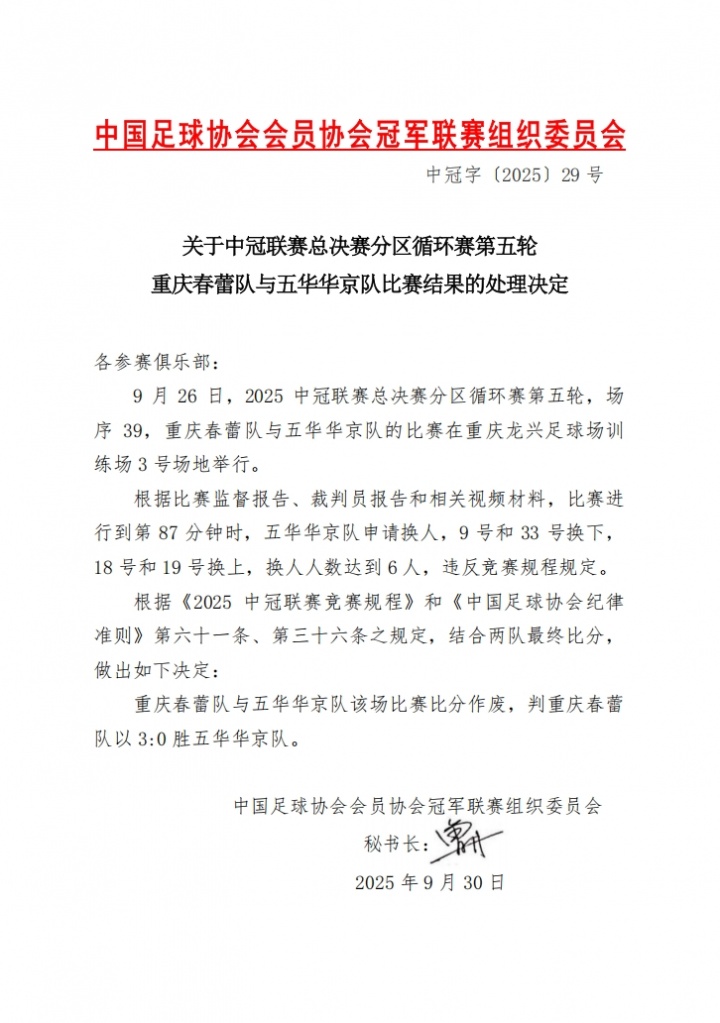 09月30日讯 中冠决赛阶段分组赛第5轮,重庆春蕾1-3不敌五华华京。中国足球协会会员协会冠军联赛组织委员会发布公告,由于五华华京队换人人数达到六人,违反竞赛规程规定,该场比赛五华华京被判0-3负。