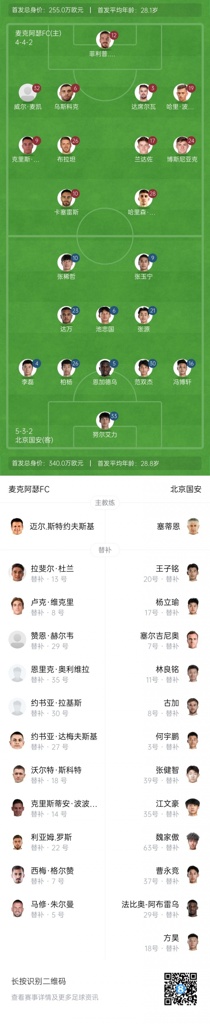 10月02日讯 25/26赛季亚冠二级联赛小组赛第2轮,北京国安客战澳超球队麦克阿瑟FC,赛前阵容公布,国安首发进行了轮换。