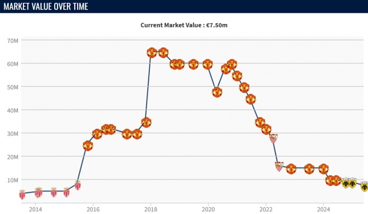 在2015年,19岁的马夏尔曾以6000万欧元转会费加盟曼联,并在当年获得欧洲金童奖。在2018年,马夏尔的德转身价达到生涯巅峰,高达6500万欧元。这位法国前锋在曼联总计代表球队出场317次,贡献90球54助。随后在去年夏天离开老特拉福德,但在雅典AEK,球员也没有找回状态。